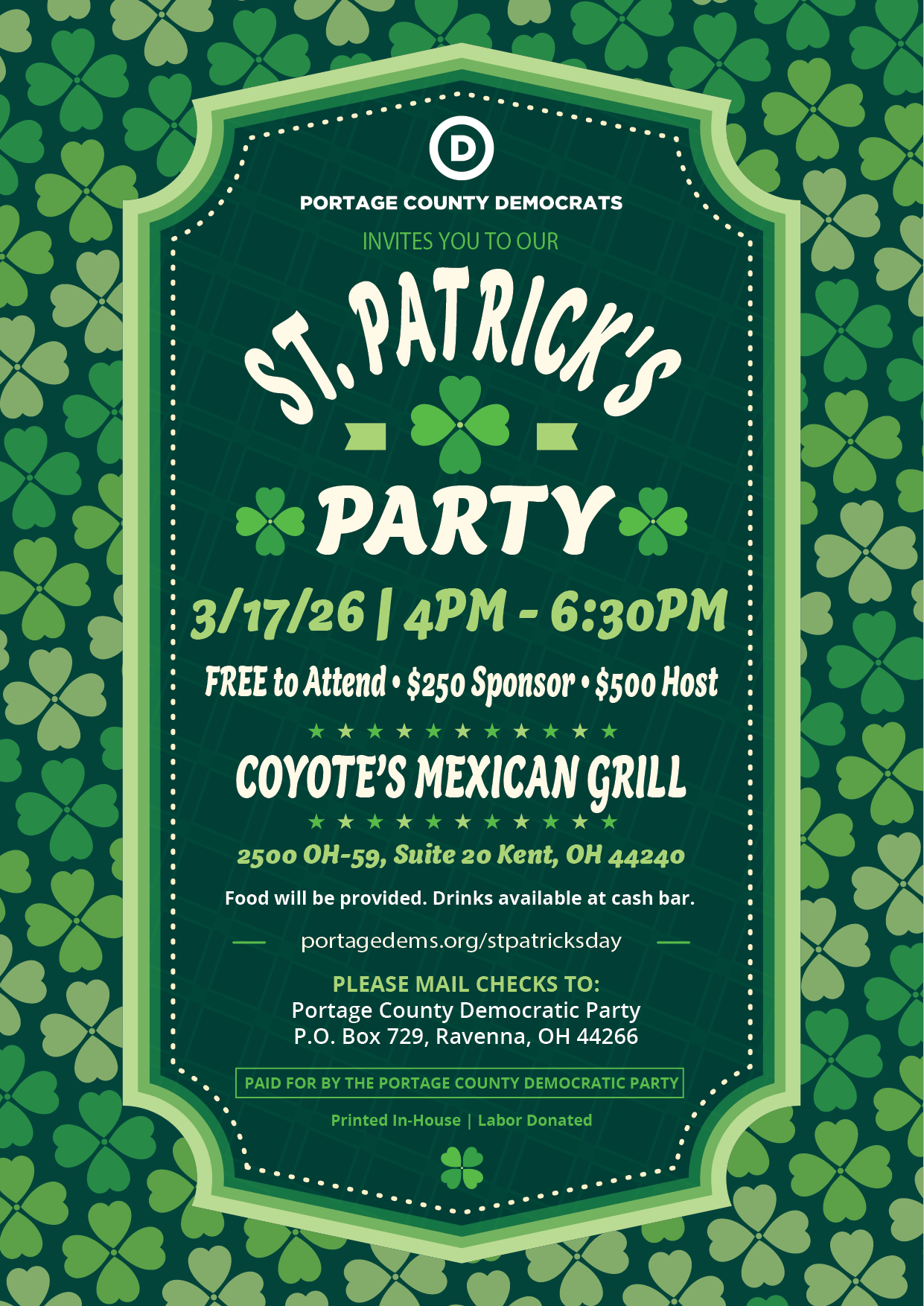 Join the Portage County Democratic Party for our annual St. Patrick’s Day Party on Tuesday, March 17th!